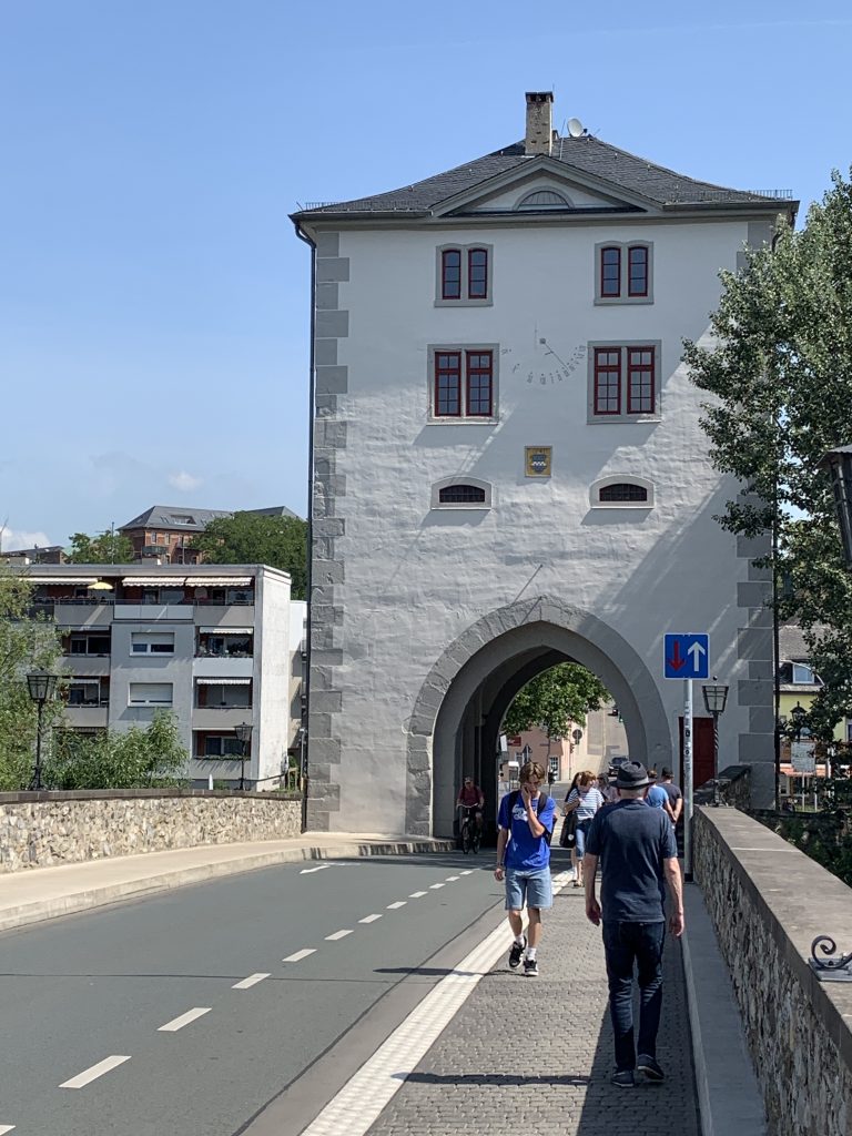 Nach diesem Abstecher geht es gestärkt lahnaufwärts und in Limburg überqueren wir für heute zum dritten Mal die Lahn. Von der Brücke haben wir einen unverstellten Blick auf den Dom, dessen Haupttürme leider eingerüstet sind. Einmal nach links wenden und von der selben Stelle aus bietet sich der Anblick des Brückenturmes.