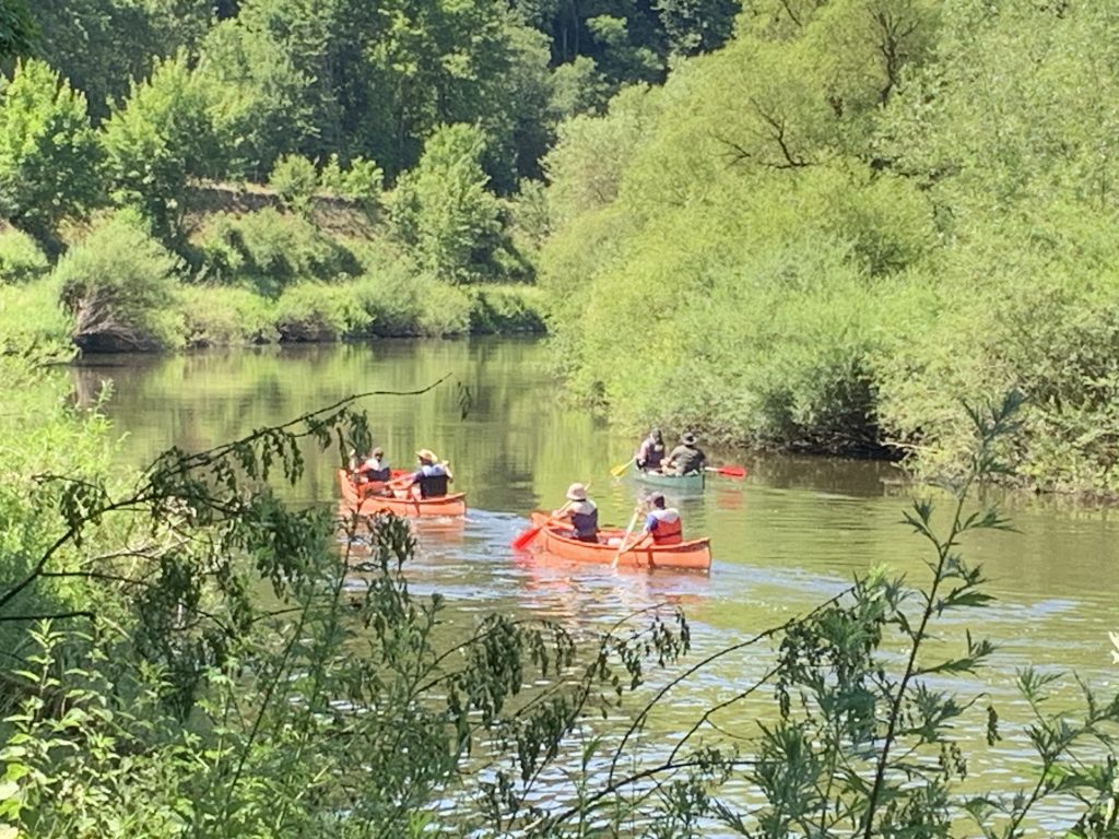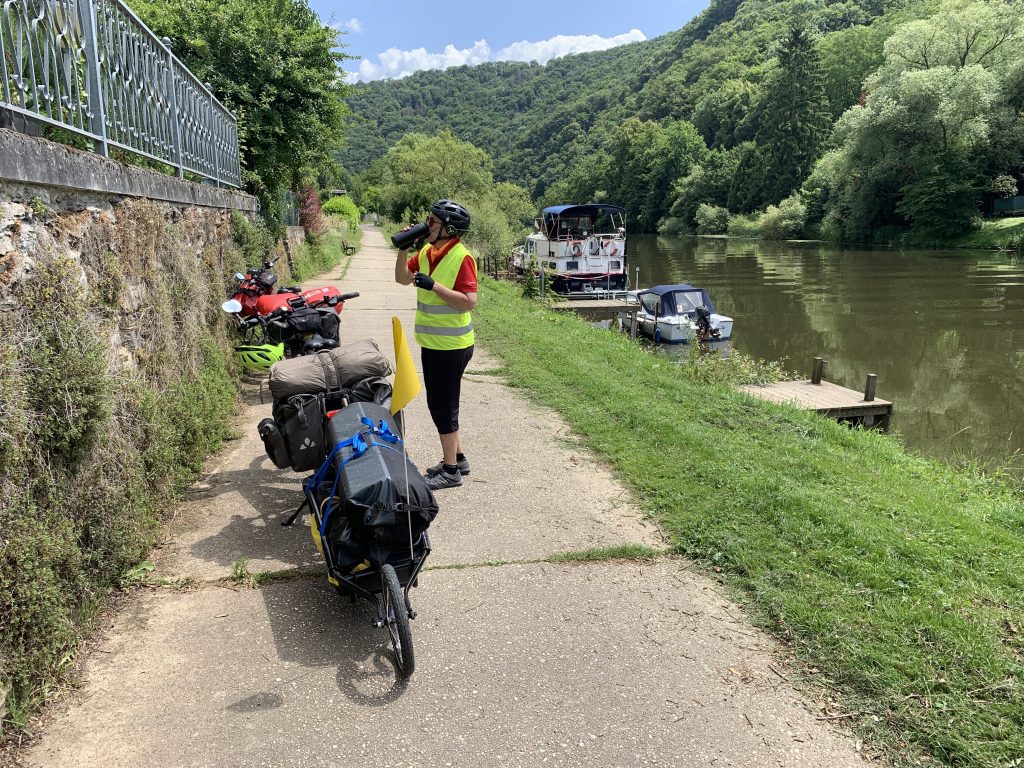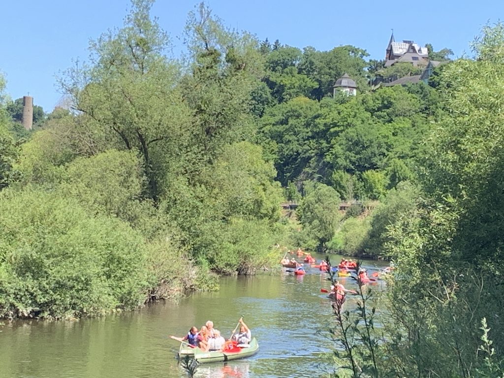 Kurz hinter Weilburg machen wir eine kleine Trinkpause. Auf der Lahn herrscht reger Schiffsverkehr. Jede Menge Menschen sind bei dem schönen Wetter mit Kanus und Kajaks auf dem Fluss unterwegs.