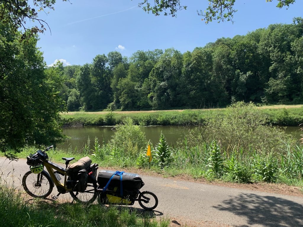 Der Trailer ist beladen, die gepackten Fahrradtaschen an den E-Bikes angebracht und die Dry-Bags mit unseren Schlafsäcken, Luftmatratzen und Kopfkissen auf den Gepäckträgern oder dem Trailer festgezurrt.