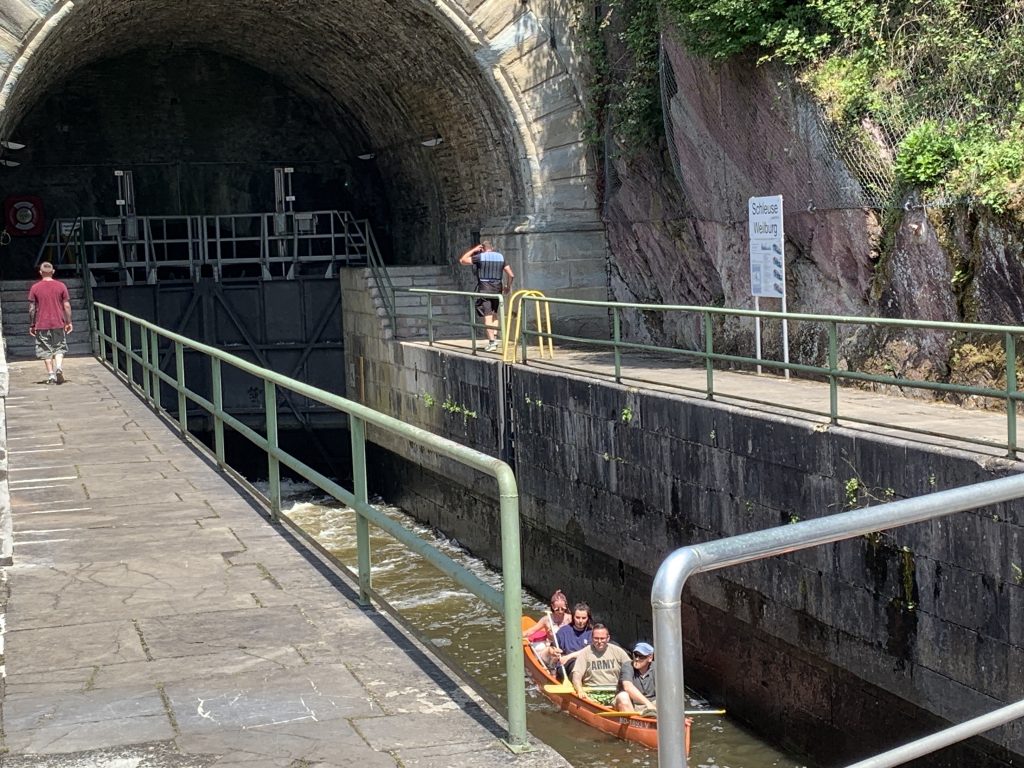 Die nun folgende Teilstrecke bis Weilburg hat einen ähnlichen Charakter, wie das untere Lahntal. Wir radeln also entlang der Lahn und passieren Dehrn, Steeden, Runkel, Villmar, Aumenau, Fürfurt und Gräveneck. Kurz vor Weilburg, bei der Anfahrt auf Kirschhofen bietet sich noch einmal ein besonders malerisches Bild. Links ein Stauwehr der Lahn und rechts der Eingang zu einem der vielen Tunnel der Bahn nach Weilburg. Kurz danach erreichen wir Weilburg und direkt am Ortseingang sehen wir einen Tunnel der besonderen Art. Einen Schiffstunnel mit Schleuse, der gerade von Freizeitpaddlern passiert wird.