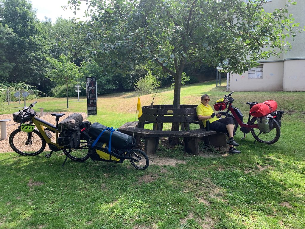 Ein holländisches Ehepaar, dass ebenfalls mit den Rädern unterwegs ist, fragt an, ob sie sich zum Aufladen ihres E-Bikes an unsere Mehrfachsteckdose anschließen dürfen. Das erlauben wir gerne.