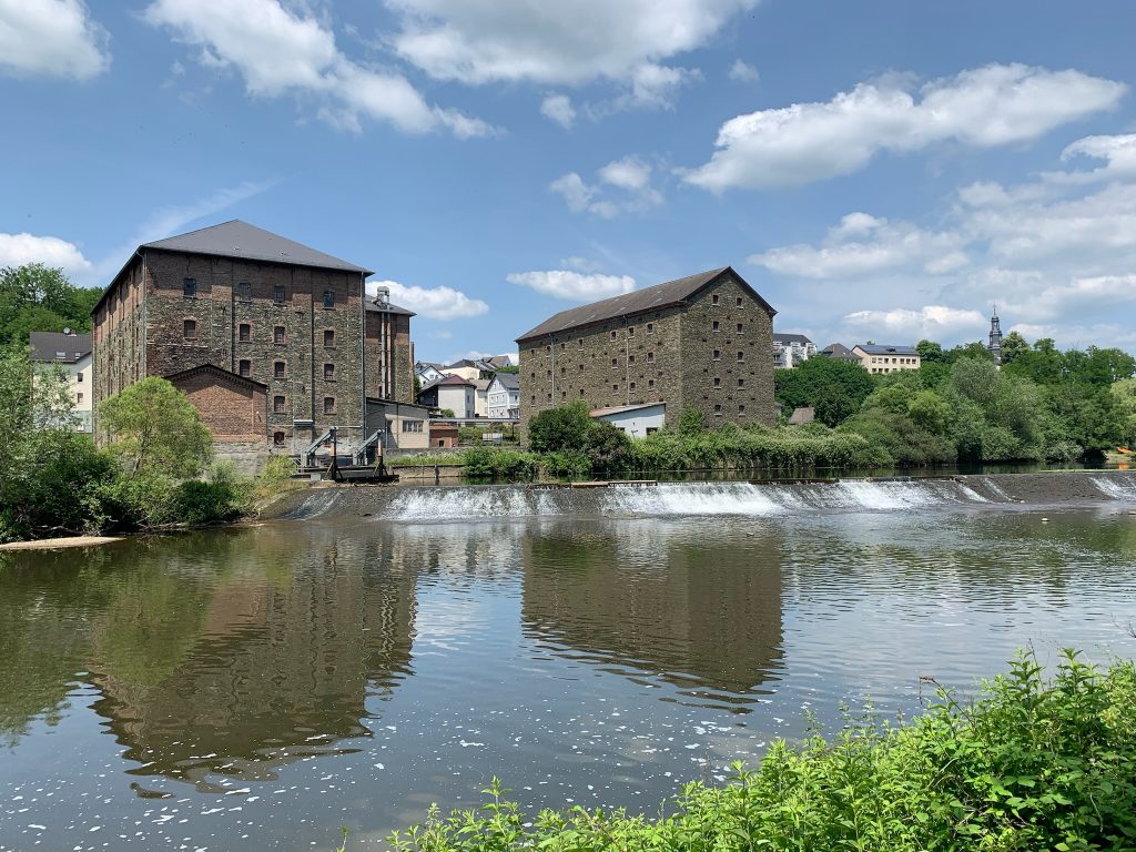Kurz hinter Weilburg, bei Löhnberg queren wir abermals die Lahn und es bietet sich ein malerischer Blick auf alte Speicherhäuser die zusammen mit der dort befindlichen Staustufe ein schönes Bild ergeben.