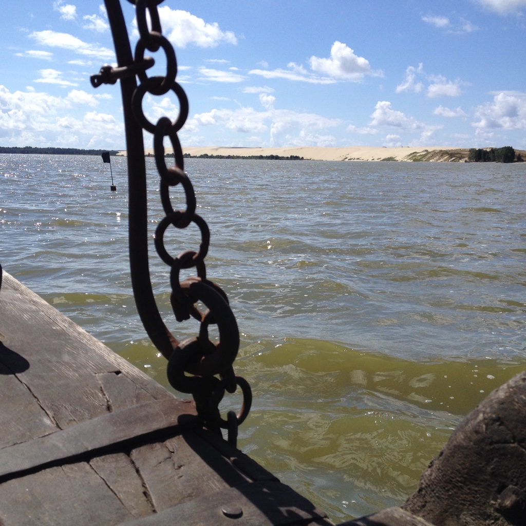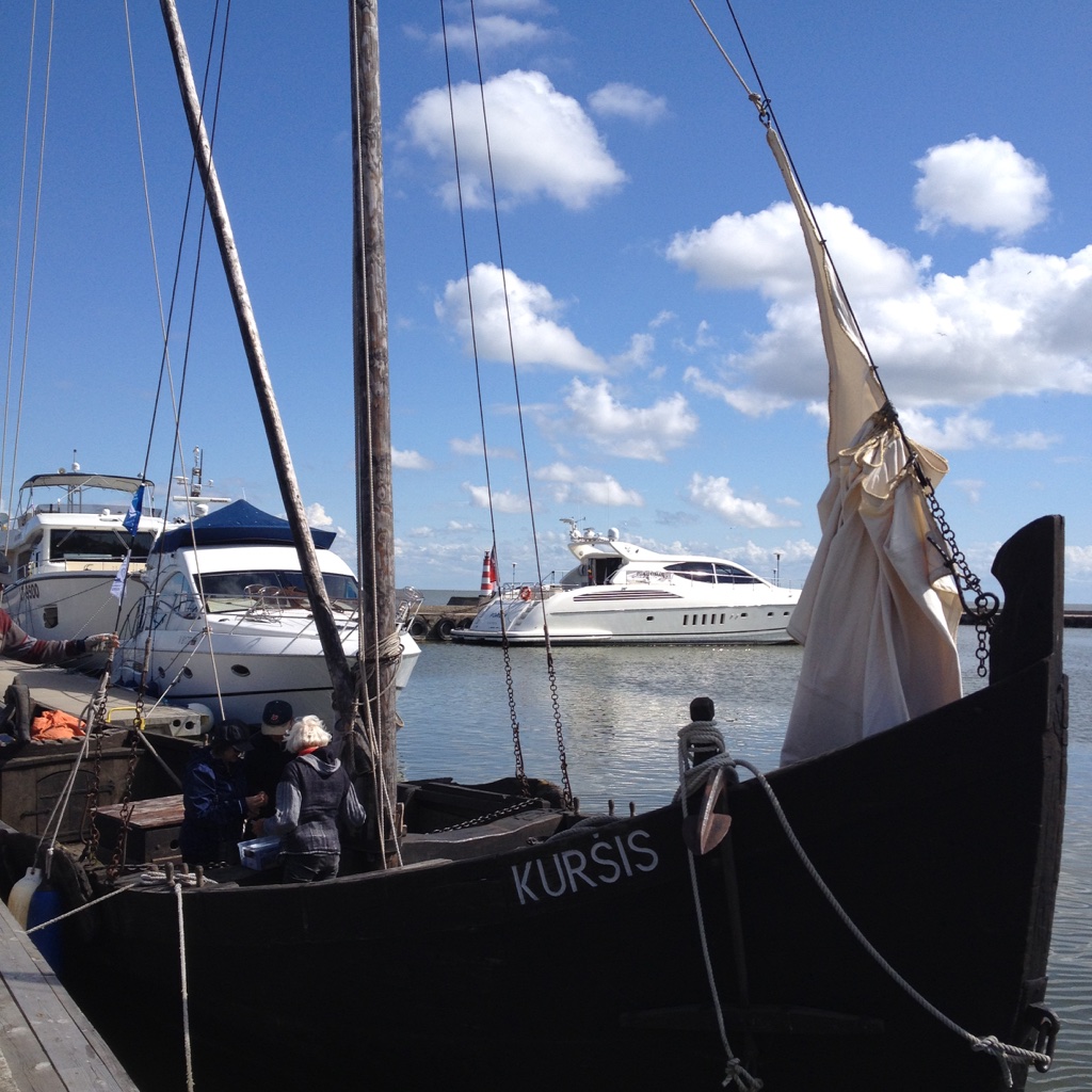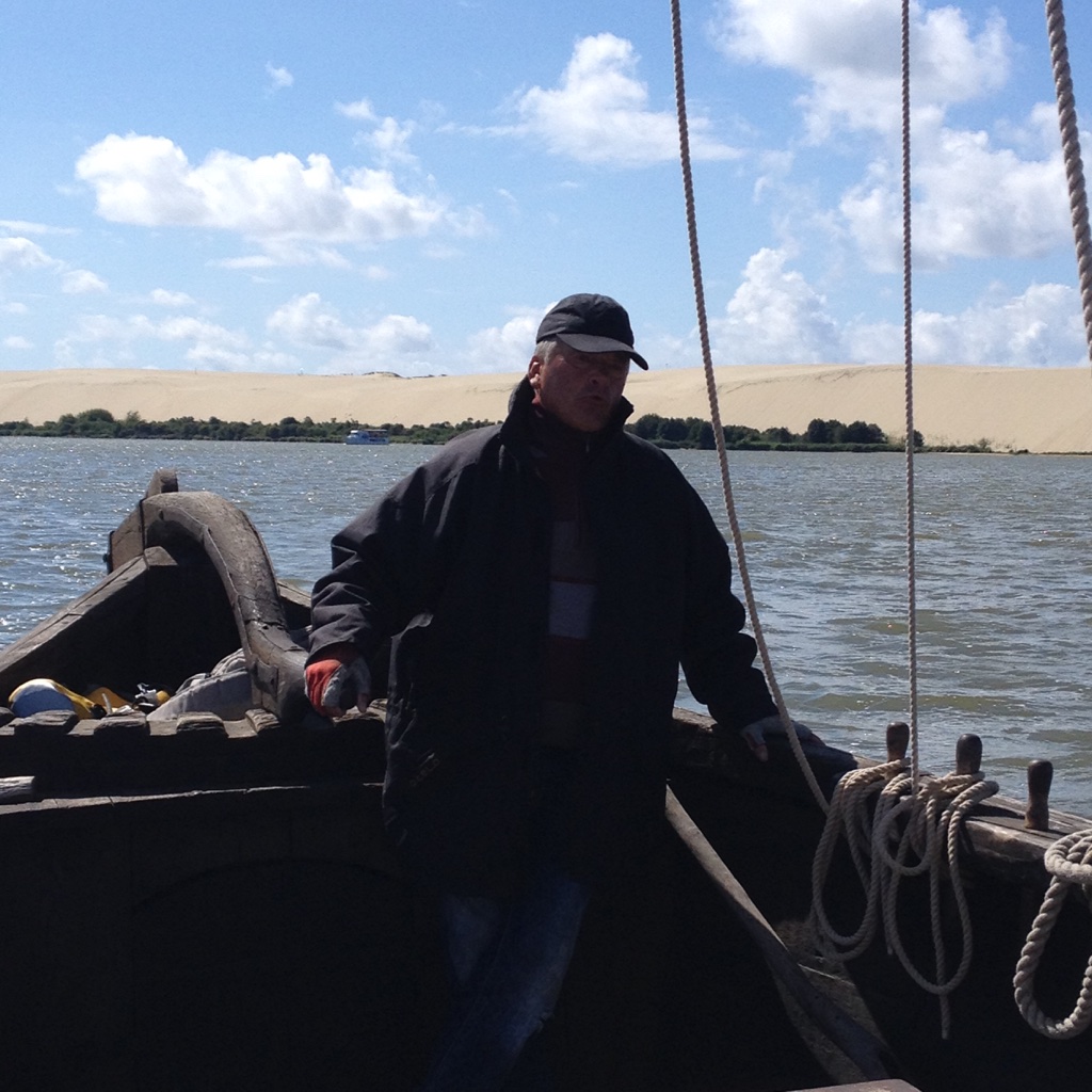 Im Hafen stoßen wir auf ein Paar, das Fahrten mit ihrem Kurenkahn, der „Kursis„, einem historischen Segler, über das Haff anbietet. Schon sind wir dabei. Gut eine Stunde schippern wir gutgelaunt über das Haff entlang der Nehrung bis kurz vor die Grenze zur Oblast Kaliningrad.