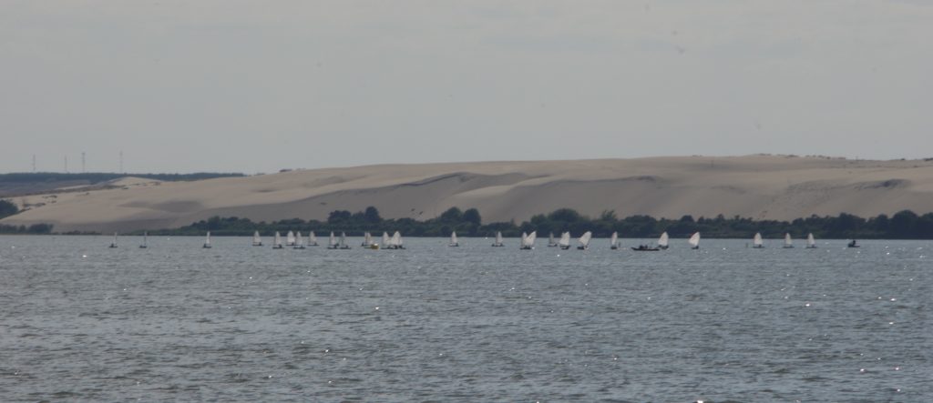 Dann geht es durch die Flußverzweigungen und über das glitzernde Haff zurück nach Nida. Unterwegs können wir noch eine Regatta von kleinen Optimisten-Seglern vor malerischer Kulisse beobachten.