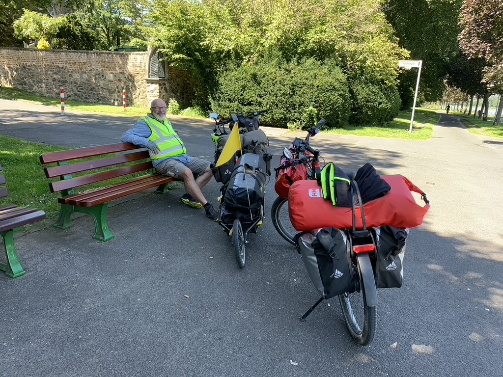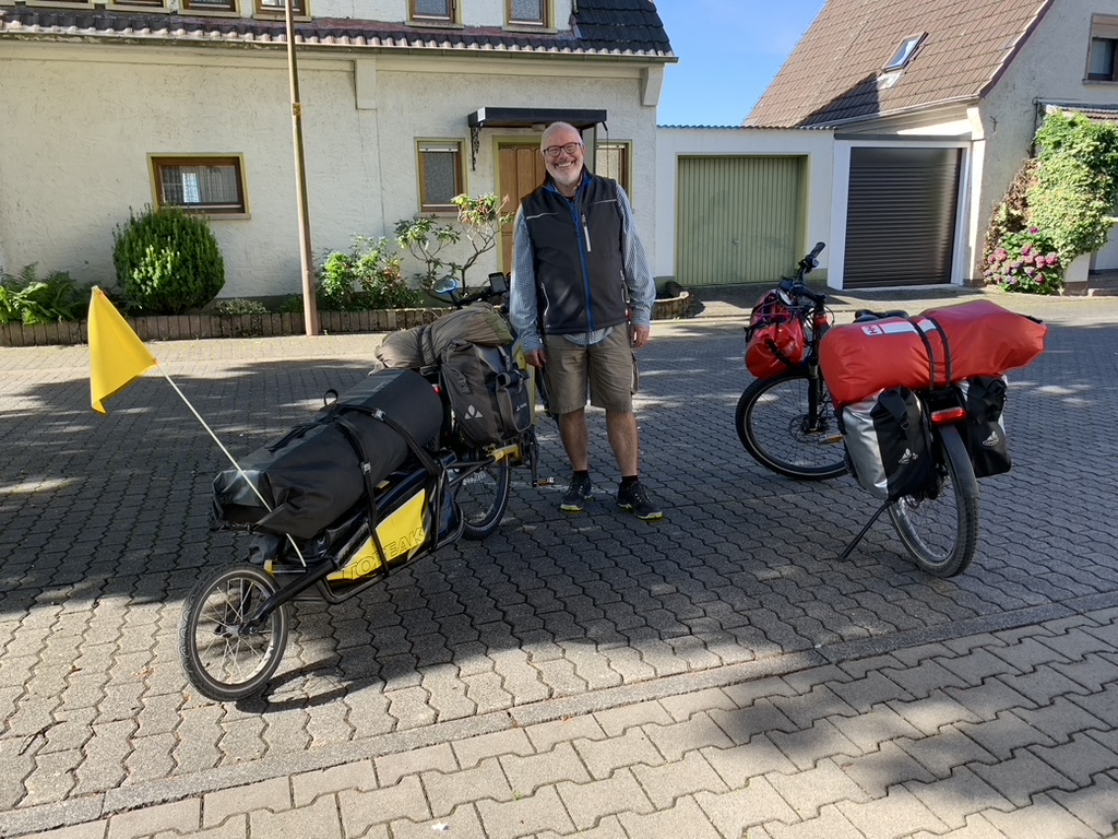 Nahezu passend zu meiner Geburtsstunde um 10:10 Uhr, fahren wir um fünf nach Zehn los. Mit Gepäck zu fahren, vor allem mit der Tasche auf dem Frontgepäckträger, ist doch gewöhnungsbedürftig. Etwas unsicher fahre ich den Gassenweg hinunter. Aber bis zum Rheinufer habe ich mich daran gewöhnt. Und dann läuft‘s. Auch die Nervosität ist gewichen. 88 km bis Köln liegen vor uns.