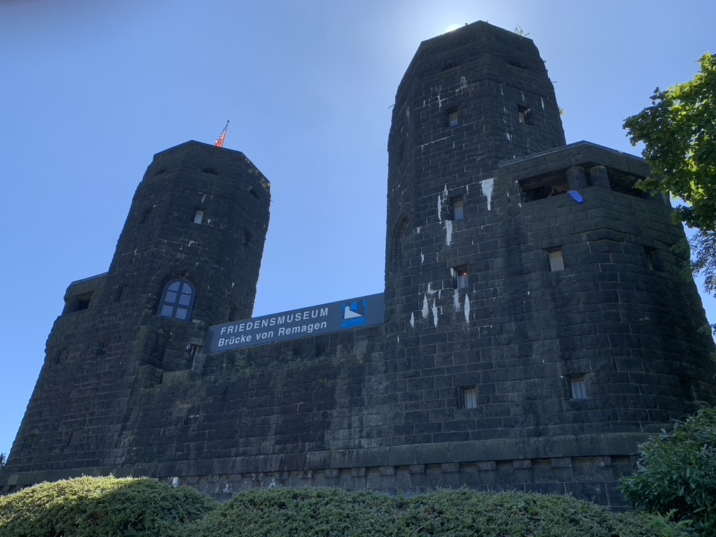 Unser Weg führt uns vorbei an der Brücke von Remagen, der Ludendorff-Brücke. Im ersten Weltkrieg erbaut und im zweiten zerstört, ist sie ein Monument für Frieden und Freiheit und beherbergt heute ein Friedensmuseum. Ein wenig bedrückend wirken die schwarzen Brückenköpfe schon – als ein Mahnmal ragen sie in den blauen Himmel.