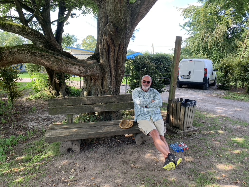 Wir versorgen also unsere „Pferde“ und bauen unser „Haus“. Dann warten wir, dass die Rezeption öffnet. Zwar gibt es einen Biergarten, aber der hat nur am Wochenende geöffnet. So müssen wir uns an einem Automaten mit kalten Getränken versorgen, denn unser mitgebrachtes Wasser hat mittlerweile die Temperatur von Badewasser. An einem kleinen künstlich angelegten See finden wir ein Schattenplätzchen, denn die Sonne bretzelt ganz schön. Zwei ältere Damen vergnügen sich laut juchzend im kühlen Nass mit ihren Poolnudeln – ein köstliches Schauspiel, das uns ein wenig die Zeit vertreibt.