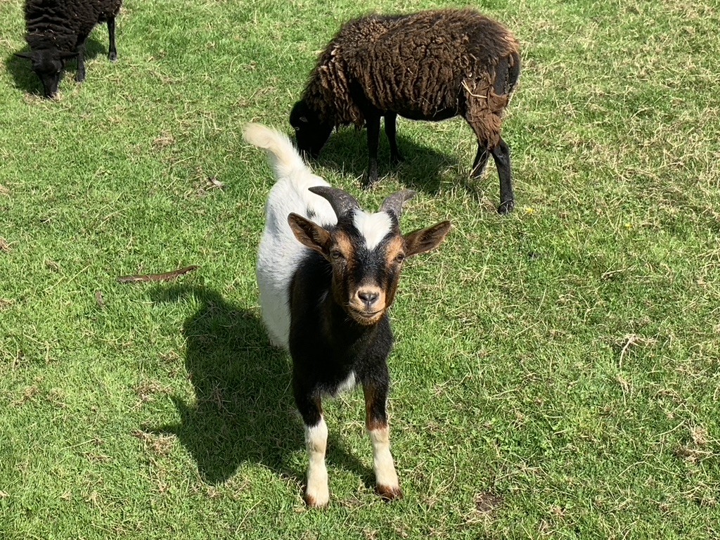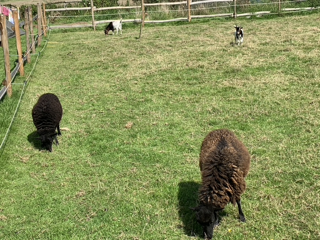 Und so ist es auch. Wir werden gleich von einer Familie aus dem Schwarzwald empfangen. Zwei Ziegenböckchen und drei Schafe in einem kleinen Gehege kommen ebenfalls neugierig angaloppiert, verlieren aber schnell das Interesse an uns. Wir haben halt kein Futter dabei und auch sonst nichts zu bieten.