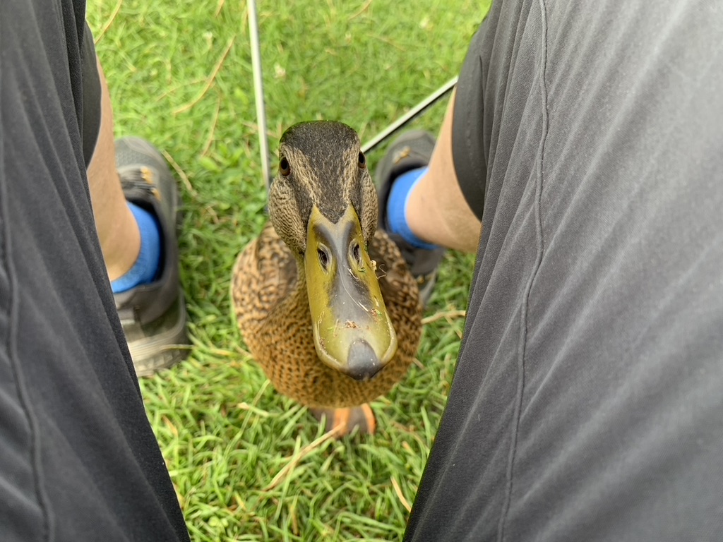 Der Campingplatz Jagtvelt bietet einen Brötchenservice an, von dem wir gerne Gebrauch machen. So frühstücken wir nach einer ruhigen Nacht, noch vor Ort und bekommen tierischen Besuch: eine ganze Entenschar spaziert von Zelt zu Zelt. Sie sind offenbar daran gewöhnt, hier versorgt zu werden.