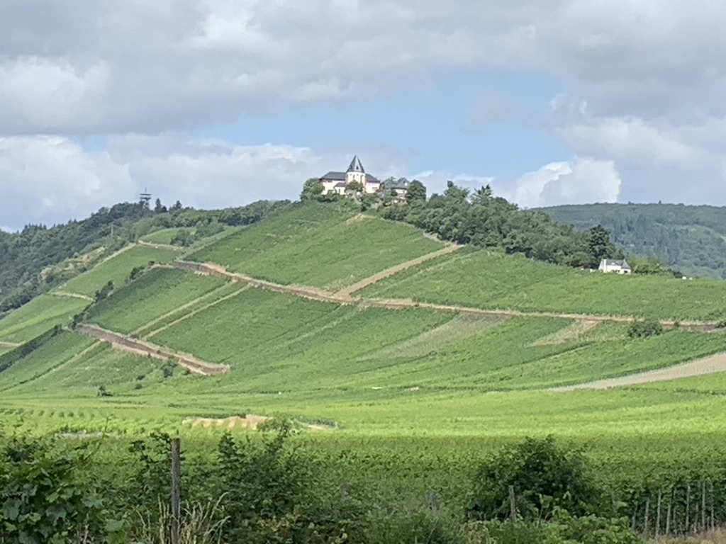 Kurz hinter Bullay, machen wir Halt unter einem Kastanienbaum und fotografieren die Marienburg, ein ehemaliges Augustinerkloster, das heute Jugendbildungsstätte des Bistums Tier ist. Sie thront oben auf einem Hügel. Die Landschaft ist hier recht lieblich. Innerhalb der Moselschleife umrunden wir Zell und folgen dann der verschlungenen Mosel bis zum Campingplatz Erden, unserem heutigen Ziel.
