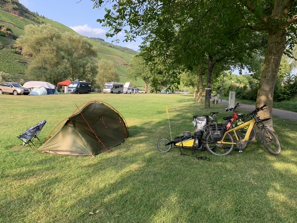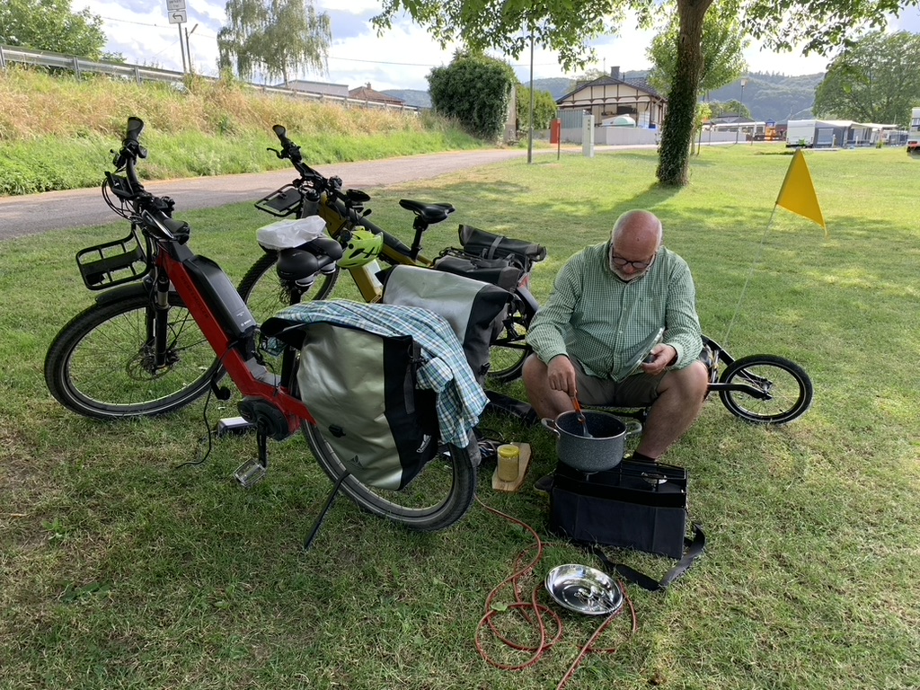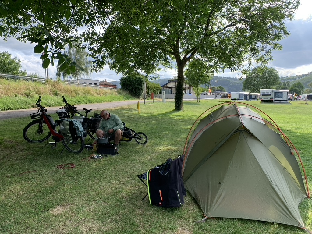 Auf einer großen Wiese abseits der Dauercamper finden wir gegenüber Weinreben, interessanten Felsformationen und unmittelbar an der Mosel einen schönen Platz für unser Zelt, Stromanschluss und Wasser sind ebenfalls in der Nähe. Heute wird gekocht.