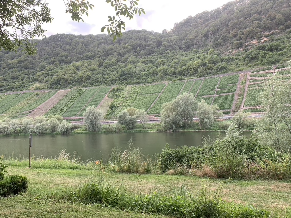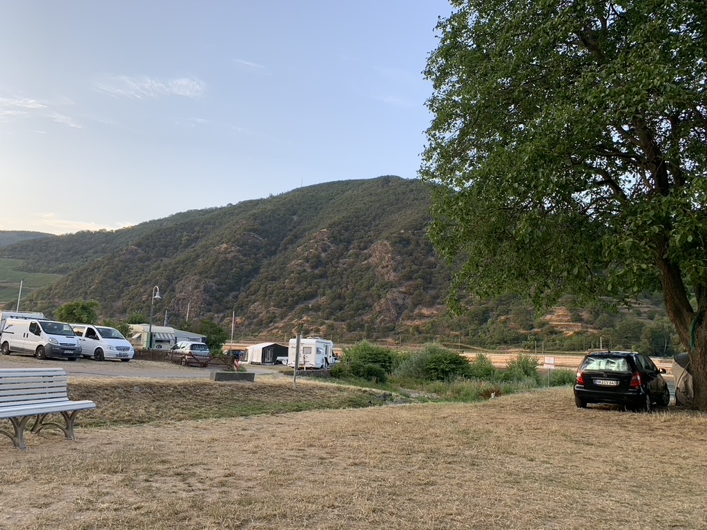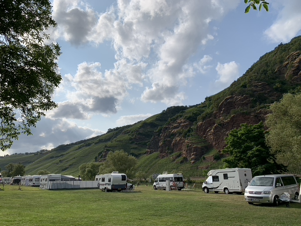 Irgendwann geht es dann los. Zuerst nach Koblenz, dann Mosel-aufwärts bis Bruttig. Wegen der Geräuschkulisse wollen wir Cochem und die Bahnlinie, die hier in einen Tunnel führt, hinter uns lassen. Die meisten Mosel-Campingplätze liegen leider, dem engen Tal geschuldet, unmittelbar an der Straße und schlimmstenfalls noch an der Bahn.