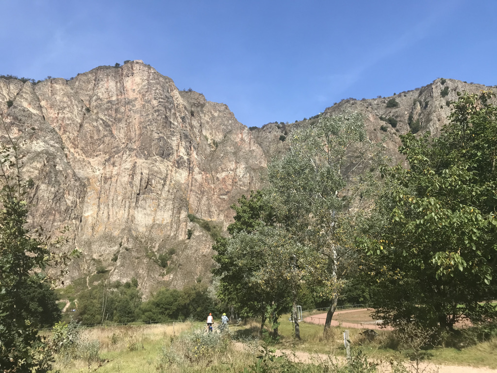 Hinter Norheim ragt mehr als 200 Meter über der Nahe der imposante Rotenfels auf. Er ist die höchste Steilwand nördlich der Alpen. Kurz darauf erreichen wir Bad Münster am Stein mit dem 245 Meter hohen und ebenso imposanten Rheingrafenstein. Hier gönnen wir uns einen dicken Eisbecher, den haben wir uns verdient.